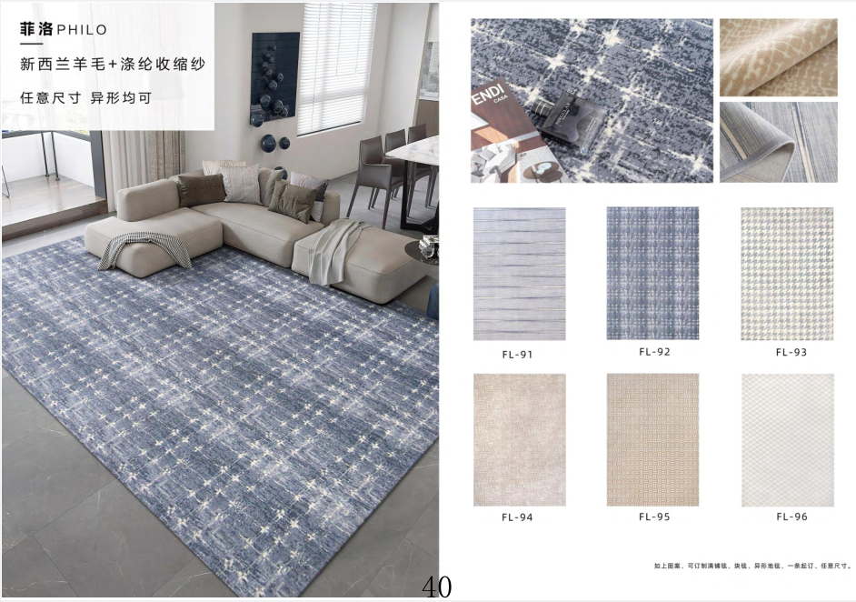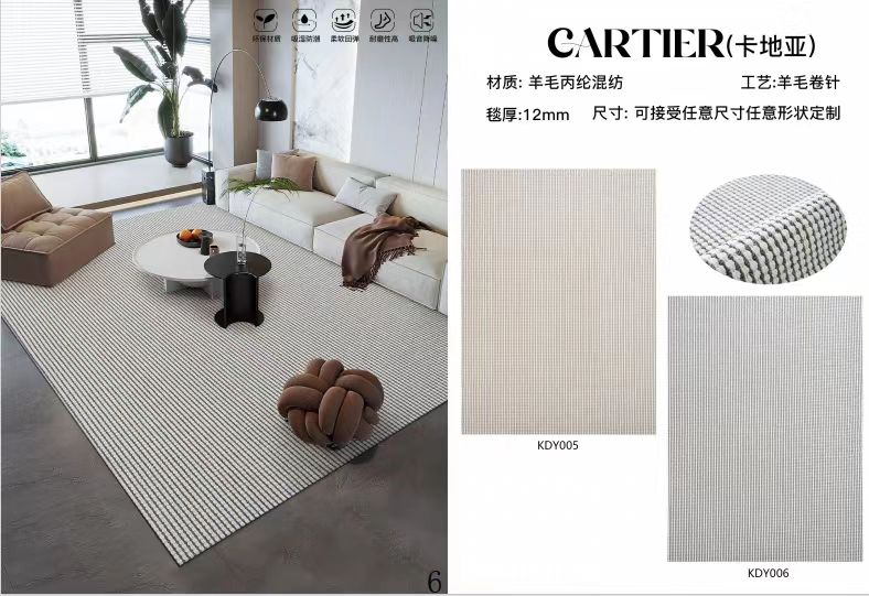 Decoration Carpet Co., Ltd. is a home decoration culture company specializing in carpet production, development, product integration and sales service in one. The company has a wide range of products, novel design, the main products are: woven tufted carpets, handmade acrylic and wool carpets, Wilton woven carpets, natural sisal carpets and a variety of fur carpets, launched a series of fashion avant-garde and post-modern, new Chinese, neo-classical style carpet, and can be customized to the drawings and samples, it is the design is the ideal choice.The company to foreign sales, direct stores, factory supporting, furniture accessories, undertake projects and other diversified marketing model.We have a group of high-quality, professional, experienced sales management team, and with a number of well-known domestic furniture brands, real estate, design companies to form strategic partnerships.Companies adhering to the "innovation, efficiency, first, beyond the" corporate philosophy, with high-quality products and marketing model in a timely manner for new and old customers at home and abroad to provide thoughtful service, we look forward to cooperating with you, and work together to weave a better living space.
